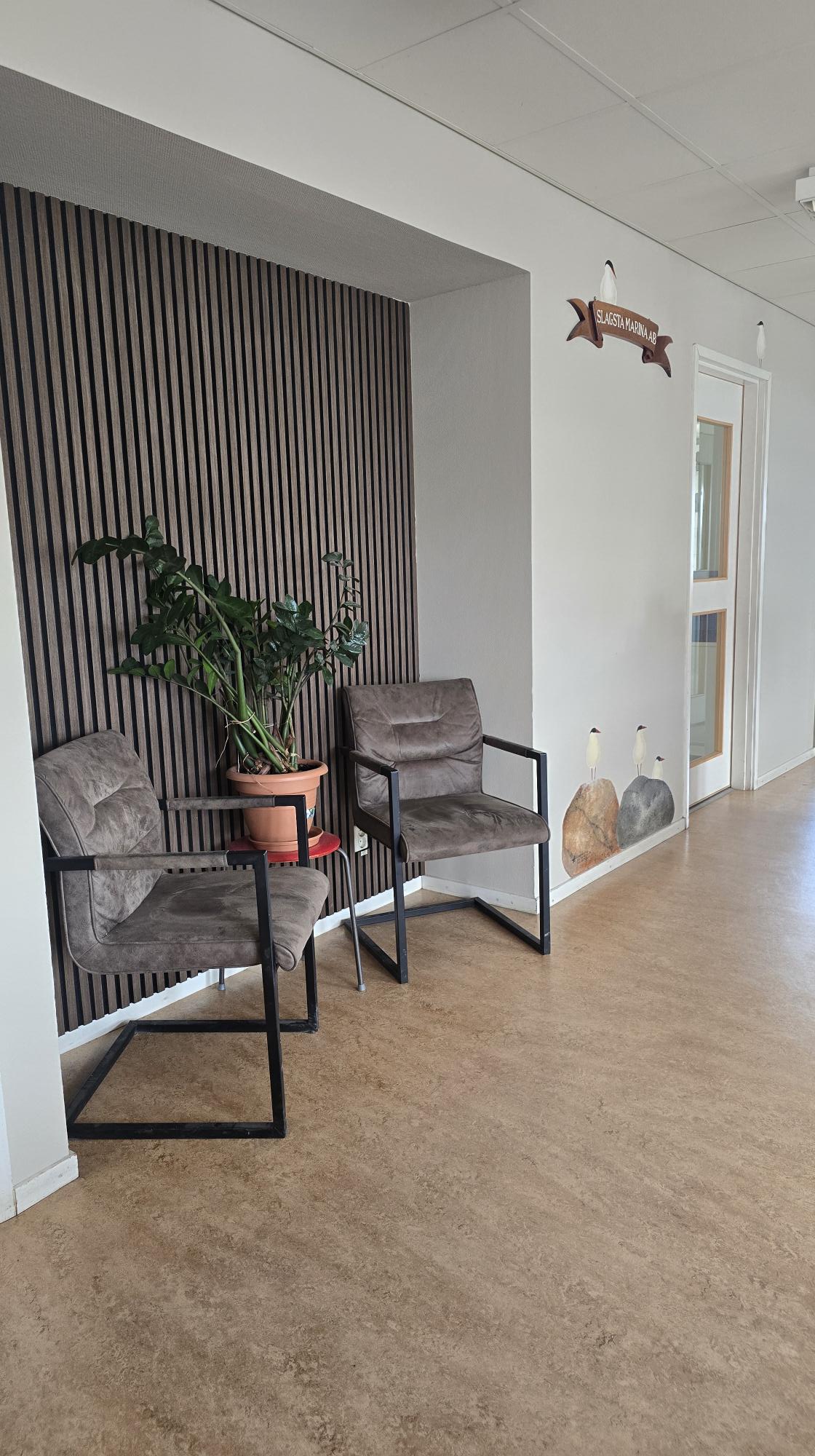 Nu möts man som besökare av en modern och snygg receptionsdisk samt ny akustik-panel på väggarna. Våra golv har slipats och behandlats, och nya möbler har köpts in.